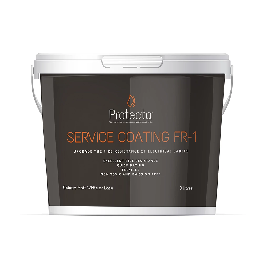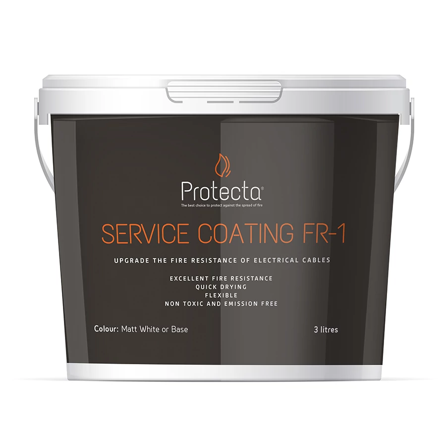 A Protecta® Service Coat FR-1 egy vízbázisú, nem mérgező bevonat, melyet különböző éghető kábelek szigetelésének biztosítására terveztek. Kitűnő tűzgátló hatása tartós, környezetbarát, nedves ronggyal takarítható anélkül, hogy a védőréteget lemosná.